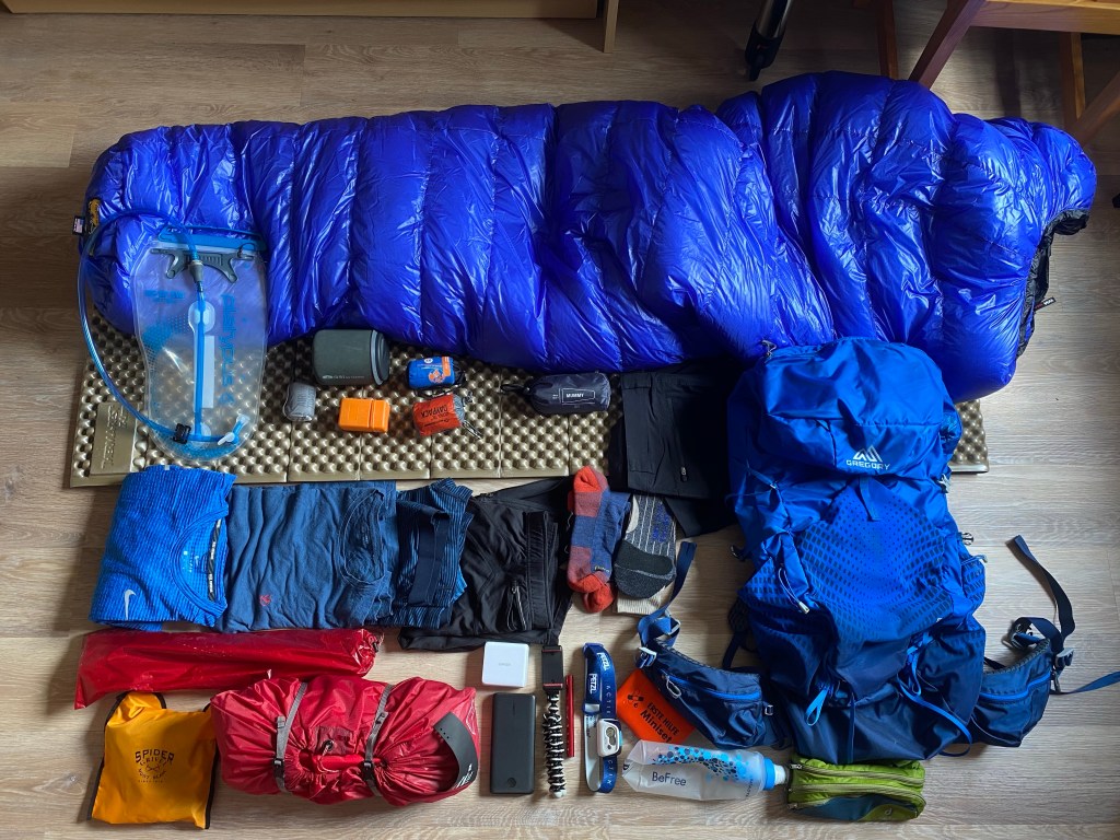 Heute habe ich mal meine ganzen Sachen, die ich mitnehmen möchte und zum Teil auch muss (Spikes), mal ausgebreitet. Noch bin ich beim Gewicht unter 8 kg! Viel weglassen geht eigentlich nicht mehr. Vielleicht kommen noch ein paar Komfortdinge (Fotoapparat oder doch bloß Handy?) dazu? Aber das will gut überlegt sein, denn ich muss auf jeden Fall noch Wasser und Esserei für wenigstens 5 Tage in den Rucksack packen! … und dann muss man das alles auch noch „bequem“ tragen können.