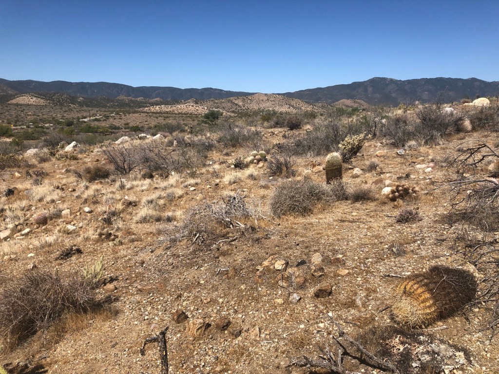 Die Dame, die mich nach Julien mitnahm, brachte mich auch wieder zurück auf den Trail nach Scissors Crossing. Das klingt irgendwie, wie alter Western. Tja, und die Wüste ist auch wie im Western. Es ist wieder schrecklich heiß. 32 Grad im Schatten, wenn es den gäbe. Man hangelt sich von einem zum anderen etwas Schatten gebenden Gebüsch. Ich habe in meinem ganzen Leben noch nie so viel Wasser getrunken! 5 Liter auf 15 Meilen! Das viele Wasser ist ja ganz gut, aber es schwemmt auch die Elektrolyte aus. Hefeweizen wäre eine Alternative, aber woher nehmen? Keine Bilder! Bloß nicht an sowas denken!