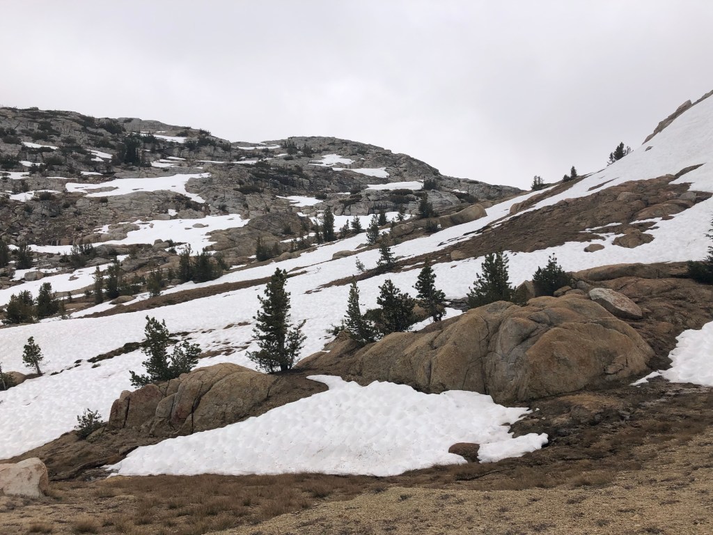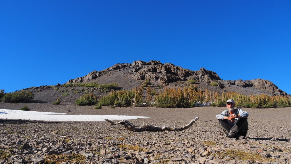 Noch ein wenig bergab und mit einigem Auf und Ab zum Höhepunkt des Tages. Grrr… 850 Meter den Berg hinauf in der Mittagshitze. Kaum ein Baum, kein Schatten, kein Wasser! Ab und zu über Schneefelder. Toller Ausblick, aber die Landschaft wie auf dem Mond.