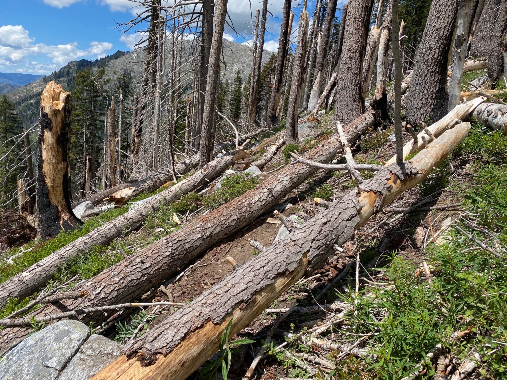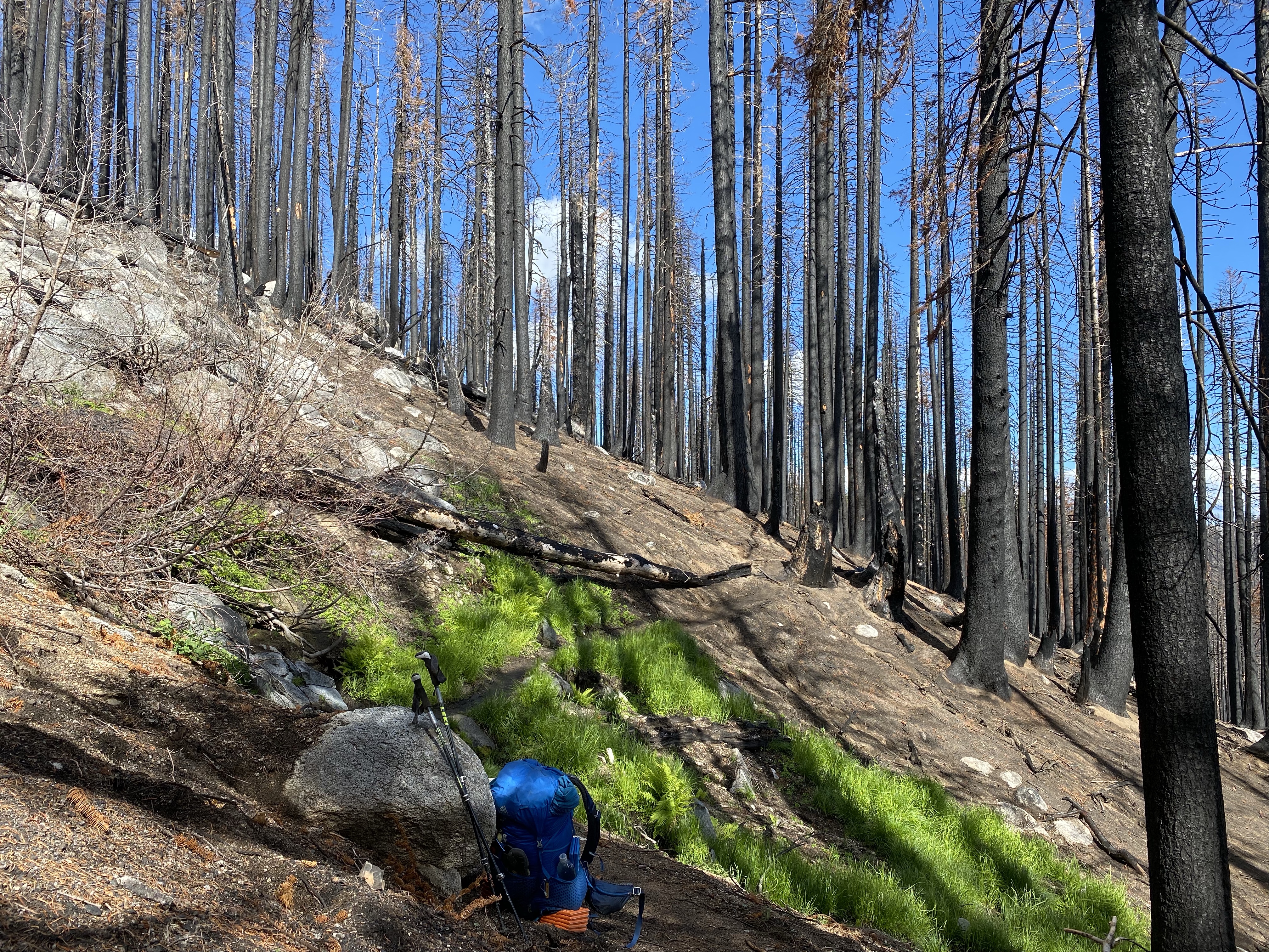 Am Nachmittag wurde es dann etwas gruselig. Ich bin etwa 5 Stunden durch verbrannten bzw. angekokelten Wald gelaufen. Wenn ich die Wanderstöcke in die Erde setzte, klang es so, als wenn man sie in Kohlengrus stieß. Und genau so klang das auch.