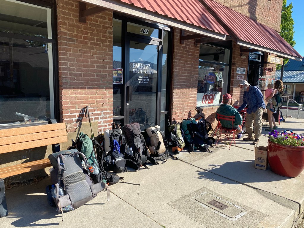 Sieht schon irgendwie witzig aus! Aber hier laufen fast alle mit den Dingern rum, da ja fast alle auch mit Trailrunnern unterwegs sind. Ich kam mir erst mal ganz schön komisch vor! So in etwa Onkel Dagobert aus Entenhausen. Aber die Dinger sind wirklich gut! Nicht ein Steinchen, keine Tannennadel und nicht mal Sand im Schuh! Die Investition hat sich gelohnt. Kurz vor dem Transfer zum Trailhead noch zum Frühstück in die Bakery. Die macht erst um 8 Uhr auf. Und da stehen dann alle Hiker, weil 8.30 Uhr fährt ja das Auto . Molly, eine Dame in den 70ern raste wie nicht gescheit die Serpentinen hinauf. Kurven wurden geschnippelt und wenn Gegenverkehr kam, hoppala…!