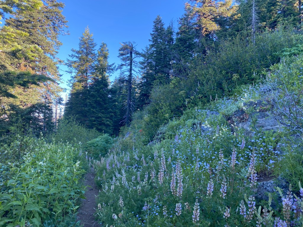 Als gegen 6 Uhr an die vorher ausgeguckte Tentsite kam, war die nicht wirklich schön! Ich habe dann in der App nachgesehen und die Nächste in 3,9 Meilen Entfernung gefunden. Das sind etwa 2 Stunden Laufen. Da es bergab gehen sollte, also eher etwas weniger! Aber denkste! Der Weg war teilweise völlig verwuchert (von den bekannten Baumhindernissen will ich nicht schon wieder anfangen) und so ist es dann auch passiert, dass ich den unsichtbaren Trail verließ ich und irgendwo im Dickicht rumgestolpert bin. Dank GPS fand ich dann doch relativ schnell, wenn auch ziemlich anstrengend, auf den Weg zurück. Beim abendlichen Gespräch mit anderen Hikern konnte ich erfahren, dass es allen gleichermaßen erging. Dies erklärt dann auch die vermeintlichen Wege durch das Dickicht und ich bin froh, dass ich nicht der Einzige war, dem das passiert ist!