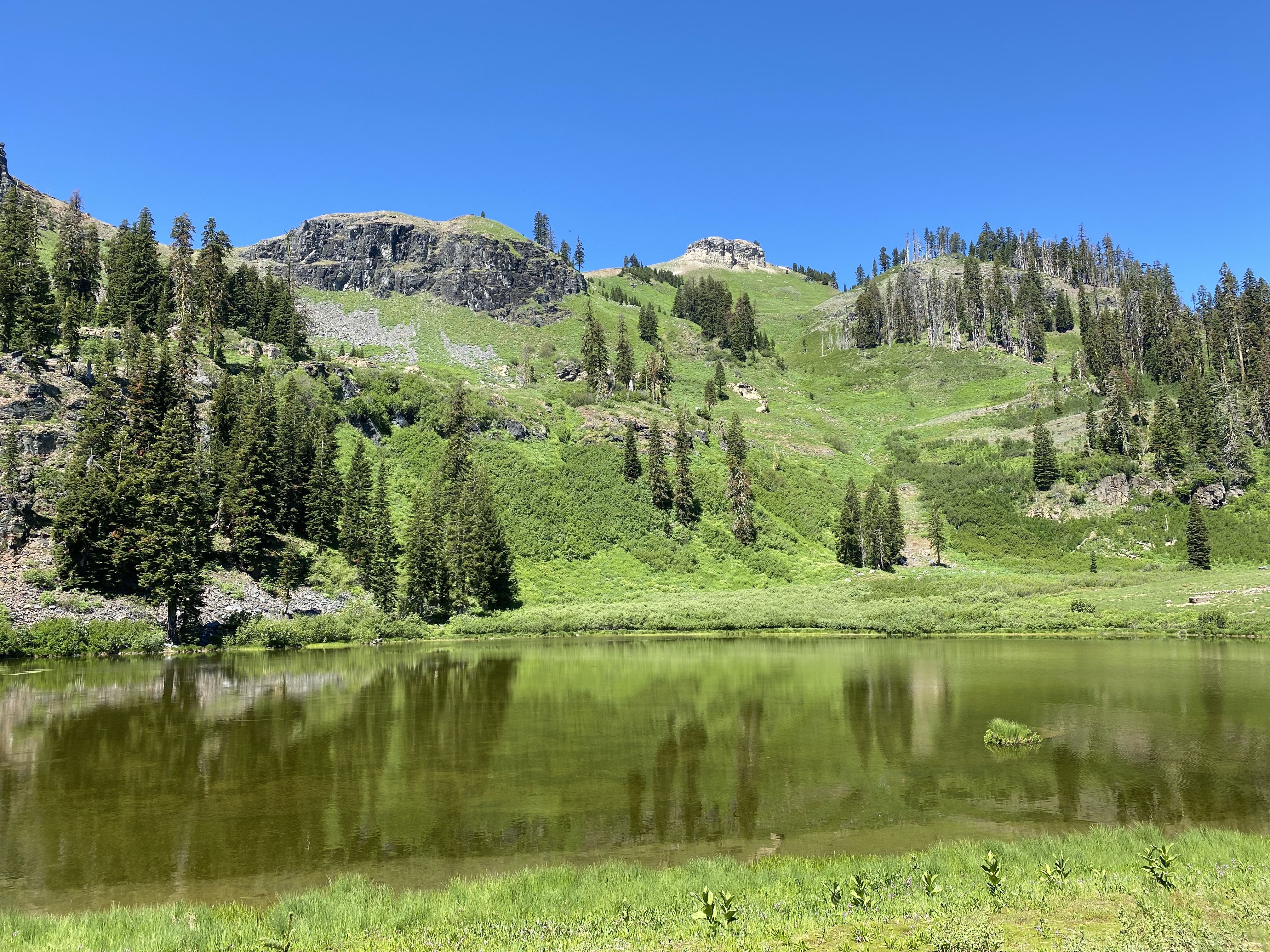 Zu Mittag hatte ich gerade einmal 8 Meilen auf meinem Konto! Okay, es ging mal wieder viel und steil bergauf. Als Rastplatz hatte ich mir einen kleinen Bergsee ausgeguckt. Er war aber sehr, sehr flach. Ansonsten wäre ich heute bestimmt ins Wasser gestiegen! Und natürlich hatte ich wieder Besuch von einem Reh. Aus etwa 3 Metern Entfernung hat es mich freundlich angeschaut. Ich aber habe ihm die Zunge rausgestreckt und schlechte Worte gesagt.