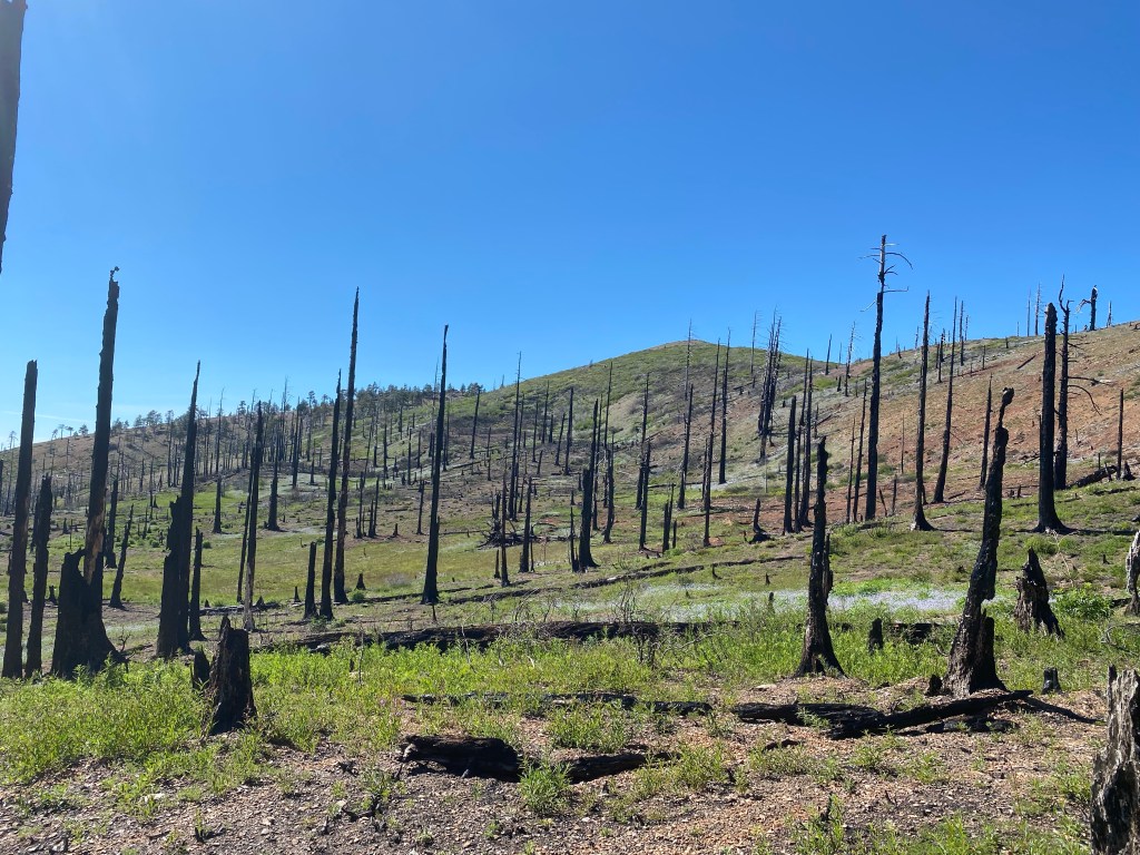Heute ging es über weite Strecken wieder durch verbrannten Wald. Also viel Schmutz, wenig bzw. gar kein Schatten, dafür jede Menge umgestürzte Bäume! Ich habe mal wieder gezählt. Heute waren es 146 richtige Bäume, über die ich gestiegen bzw. manchmal auch geklettert bin! Teilweise ging es auch wieder über Geröllfelder. Das lässt sich vielleicht bescheiden laufen! Aber manchmal macht es trotzdem Freude, die steinigen Abhänge anzuschauen. Das sieht manchmal aus, wie in einem Steingarten.