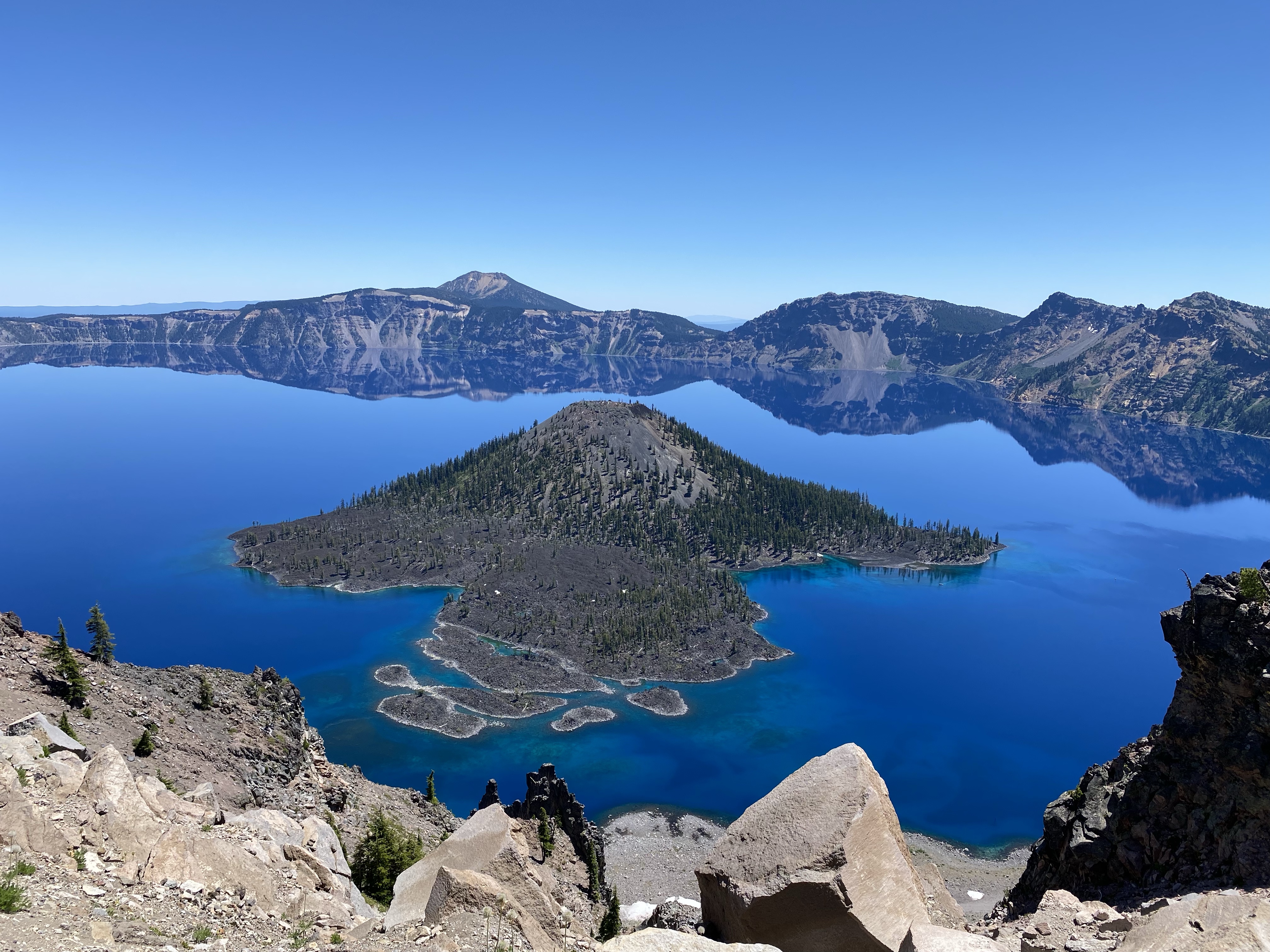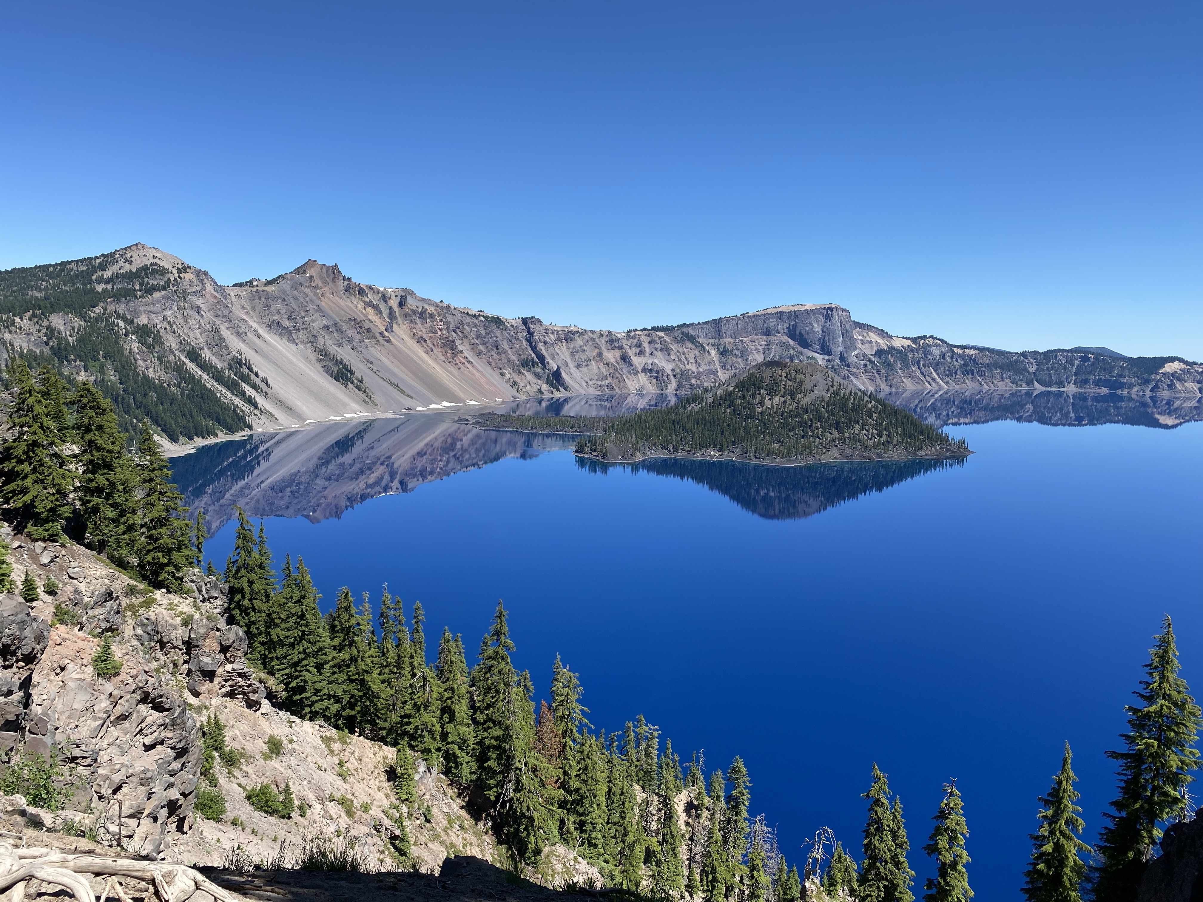 Glück gebracht hat er allerdings nicht. Nach dem ausgiebigen Frühstück oben am Crater Lake ging es dann den Rim Trail (quasi den Kraterrand) entlang. Der See befindet sich nämlich im Schlot eines Vulkans ebenso wie die kleine Insel in ihm. Und auch die ist ein kleiner Vulkan. Der See selbst ist 592 Meter tief und damit der tiefste See der USA. Und weil er so wunderschön ist, gibts gleich nochmal ein paar Bilder.