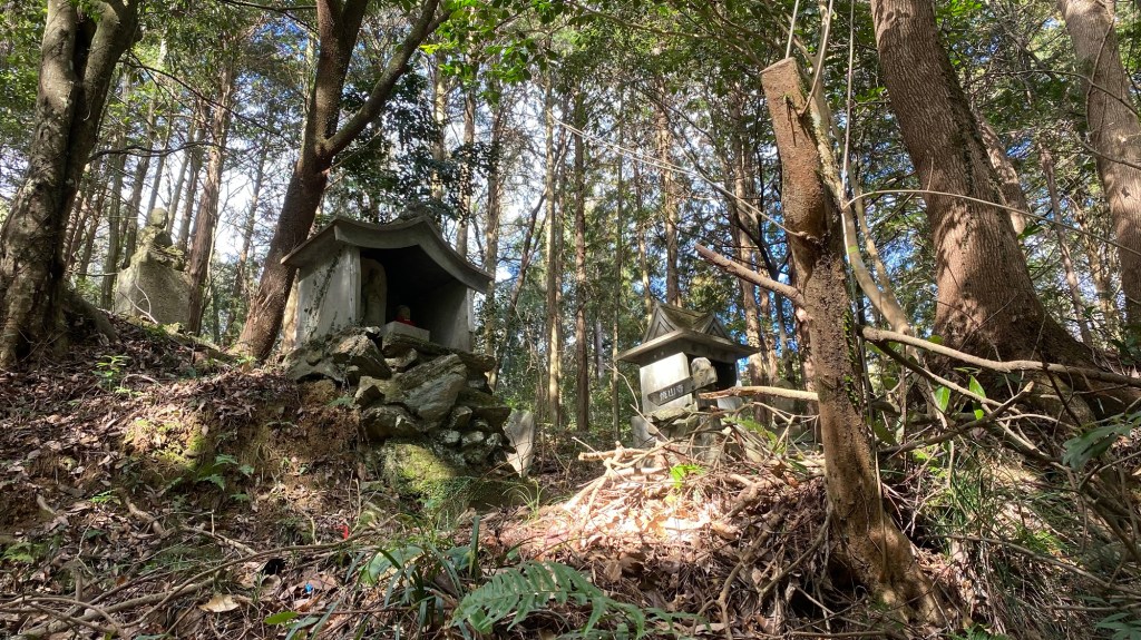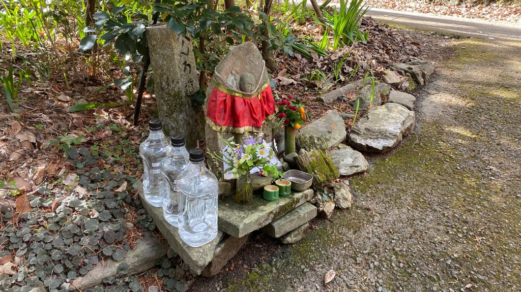 Diesmal habe ich lieber nach dem Weg gefragt. Er ging etwas versteckt zwischen den Tempelgebäuden weiter. Dann ging es los. Immer bergauf durch märchenhaften Wald. Links und rechts des Weges viele kleine Statuen und winzig kleine Steinhäuschen mit irgendwelchen Gottheiten (?).