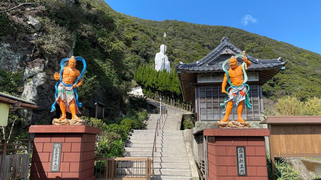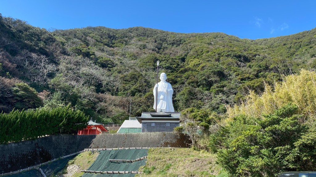 Dann ging es wieder viele Kilometer einfach nur stumpfsinnig weiter bis kurz vor dem Kap Muroto eine große weiße Statue stand. Kükai (also der, der den Buddhismus nach Shikoku brachte) in jungen Jahren). Bestimmt 20 Meter hoch! Eigentlich wollte ich daran vorbei gehen, aber dann sah ich da noch einen goldfarbenen Buddha rumliegen. Das hat mich dann doch interessiert. Der „Stempeltempel“ musste noch ein wenig warten