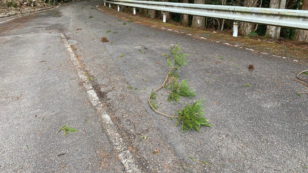 Da ich heute ein ganzes Stück auf der Straße, auf der ich nach Iburi gewandert bin, zurück musste, wusste ich auch schon, wo ich gegen 8 Uhr meine erste Rast machen würde. Ich hatte gerade meinen heißen Milchkaffee aus dem Automaten geholt und wollte mein Essen auspacken, als es plötzlich zu regnen anfing. Schnell die Regenklamotten ausgepackt und das Frühstück verstaut! Nach 5 Minuten war es vorbei mit dem Regen. Also habe ich mich auf die Bank gesetzt und gefrühstückt. Dann kam kurz die Sonne raus und ich habe überlegt, ob ich die Regensachen wieder ausziehen und verstauen sollte? Ich beschloss, sie anzulassen und als Schutz vor den kalten Wind zu tragen. Gut, dass ich so entschieden habe, denn kurz darauf fing es auch noch an, zu schneien!