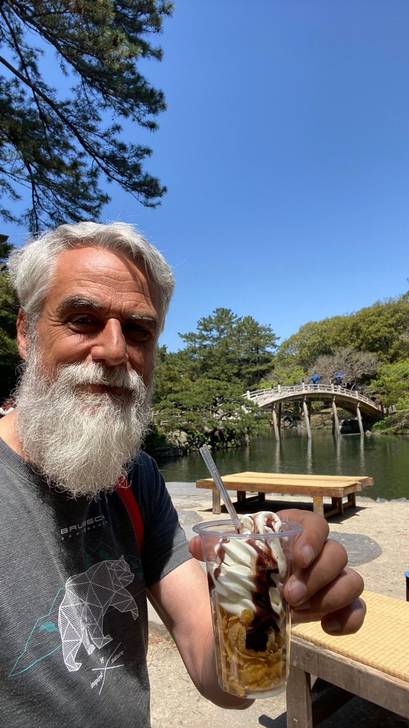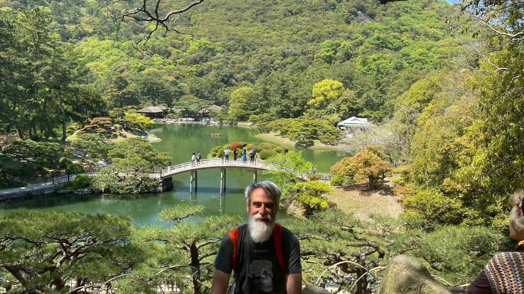 Nein, heute will ich in den Ritsurin-Park, der für seine einzigartige und größte Piniensammlung Japans bekannt ist. Dazu musste ich erst mal wieder eine Viertelstunde Bus fahren, was Spaß macht, wenn man weiß, wie’s geht. Viele Leute steigen mit mir aus, die auch alle in den Park wollen. Ich ahne Schreckliches. Aber nein, vier Kassen sind auf und ich muss nicht mal anstehen. 460 Yen (3 Euro) Eintritt und rein geht’s und verteilt sich sofort. Das heißt, beim letzten noch halbwegs blühenden Kirschbaum drängt es sich noch leicht, da noch diverse Fotos gemacht werden müssen. Dann wird es ruhig und man kann in Ruhe den Park durchschreiten. Dabei ergeben sich immer wieder neue An- und Aussichten. Einfach nur wunderschön!