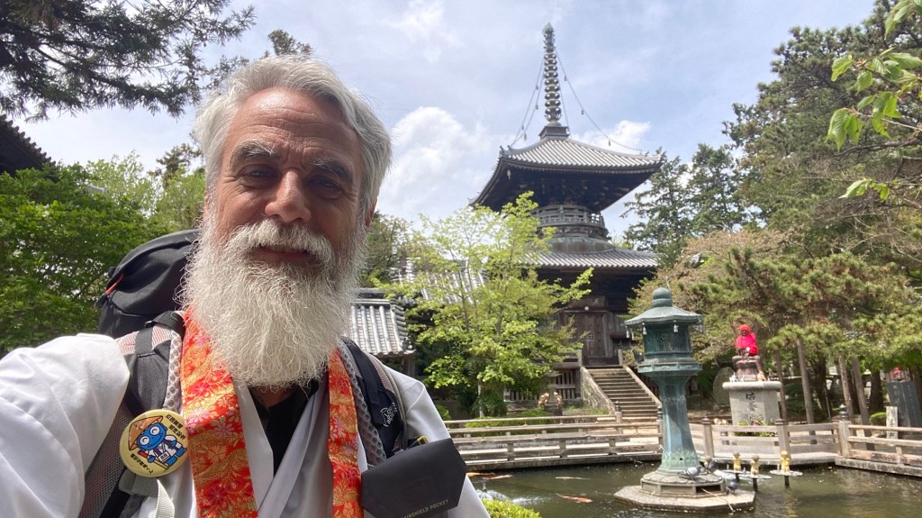 Ja, es ist schon ein besonderes Gefühl, hier nach der Tour noch einmal anzukommen. Und es ist auch ein ganz seltsames Gefühl, Leute zu sehen, die sich für die Pilgertour ausstatten und blütenweiße und bügelfaltenbehaftete Jacken und Westen anziehen. Genau so habe ich das ja auch vor ein paar Wochen gemacht! Hier im Tempelladen, der zugleich auch die Stempelstelle ist, traf ich heute einen Mann, der den Weg heute zum ersten Mal starten wird. Das ansich ist ja nichts besonderes, nur dass der Herr bereits 80(!) Jahre alt ist, ist schon sehr bemerkenswert!