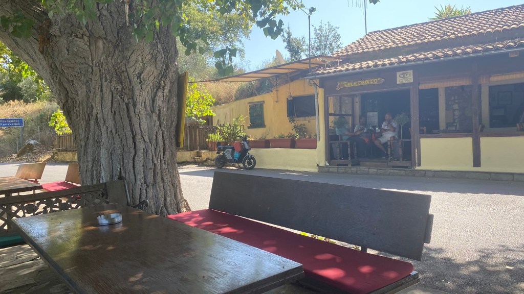 Nicht so ein Touri-Ding, sondern ein richtiges Lokal für die Einheimischen. Die Herren saßen da und tranken ganz in Ruhe ihren Kaffee. Mancher auch schon seinen Ouzo me nero! Also auf deutsch: Ouzo mit Wasser. Der wird durch das Wasser milchig und sieht dadurch sehr gesund aus! Keiner konnte Englisch oder Deutsch!