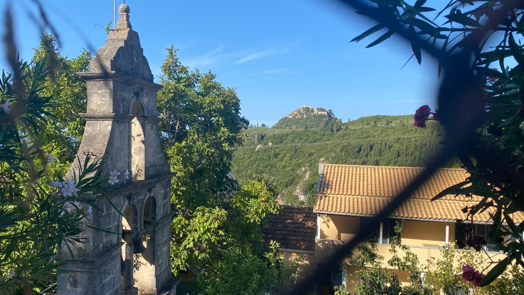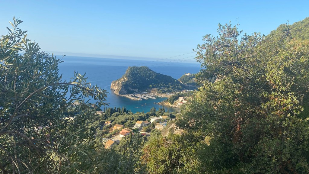 Beim Aufsteigen hat man natürlich immer mal wieder die tollsten Aussichten – so wie hier auf Paleokastritsa mit seinem wunderschönen Kloster.