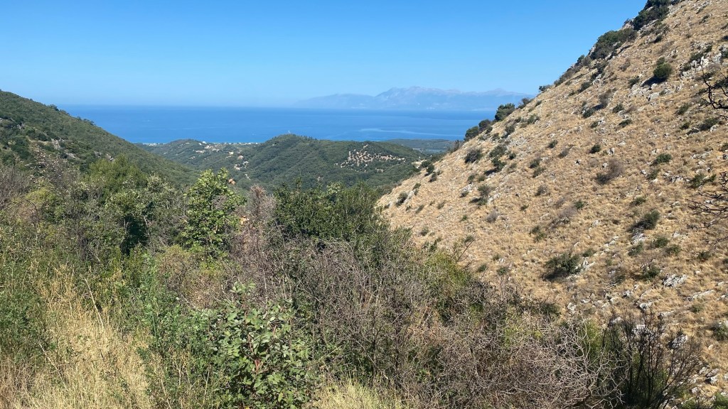 Als ich an dieser Stelle vorbei war, ging es dann nicht mehr so steil bergauf. Wäre nicht das mächtige Gestrüpp gewesen, ich hätte deutlich schneller sein können. Dann endlich öffnete sich der Wald und es ging prärieähnlich immer weiter auf den Pantokrator, den höchsten Berg Korfus, zu.